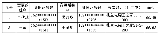 根據(jù)內蒙古森工集團棚戶區(qū)改造工程不動產(chǎn)分戶登記工作要求,現(xiàn)將金河森林工業(yè)有限責任公司棚戶區(qū)不動產(chǎn)分戶登記變更名單公示如下,公示期限:2023年11月17日---2023年12月2日。如有異議請聯(lián)系工作人員。